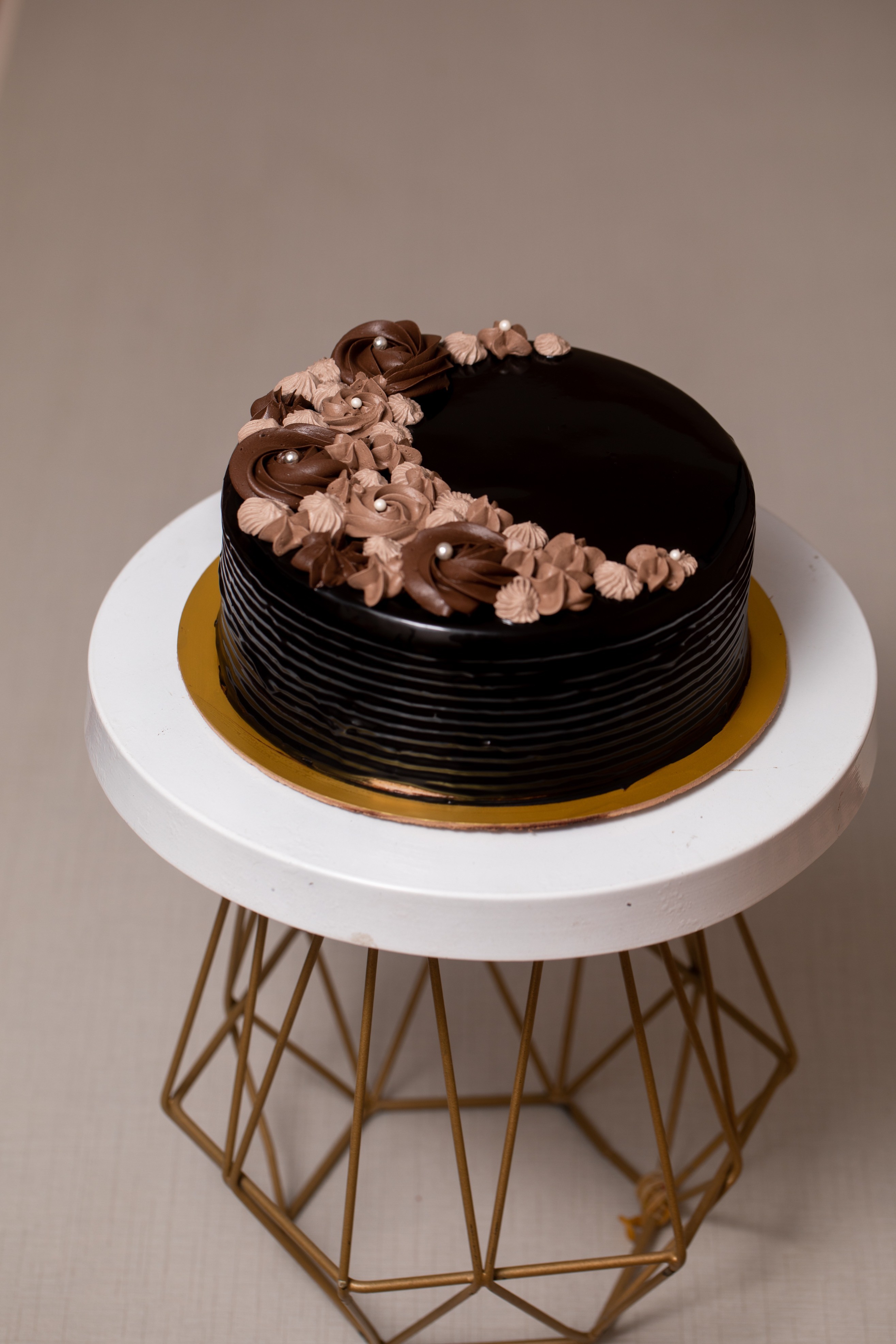 Chocolate Cake Fluffy sponge cake filled with chocolate cream layer and coated in dense chocolate ganache.